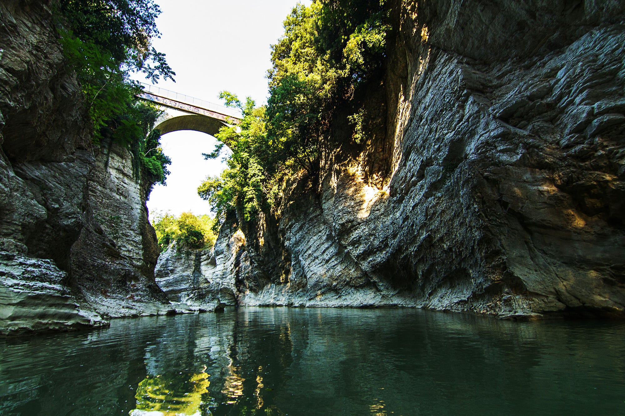 Le Marmitte dei Giganti si inseriscono all’interno di una suggestiva fossa dalle alte pareti verticali (30mt sopra il livello del fiume) che può essere ammirata al meglio dal Ponte dei Saltelli posto nelle vicinanze della faglia e che rende l’idea dell’importanza storica della zona.